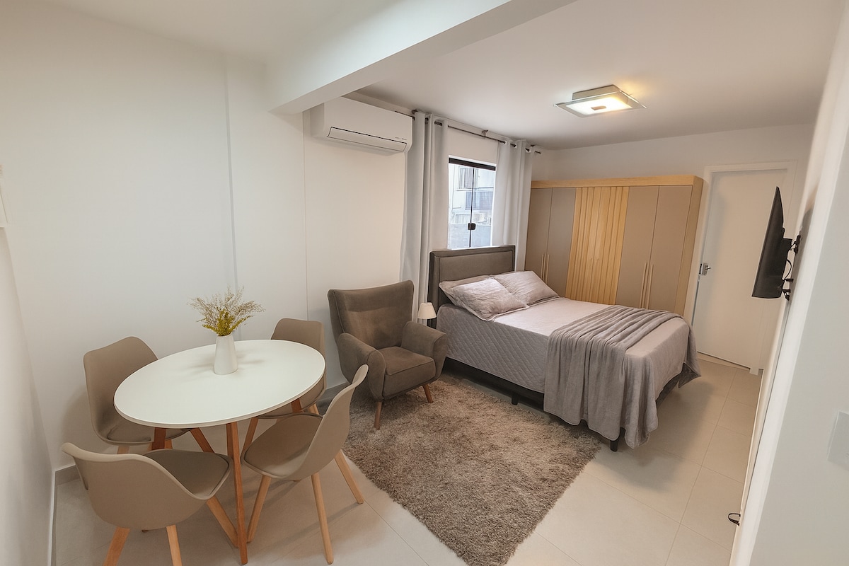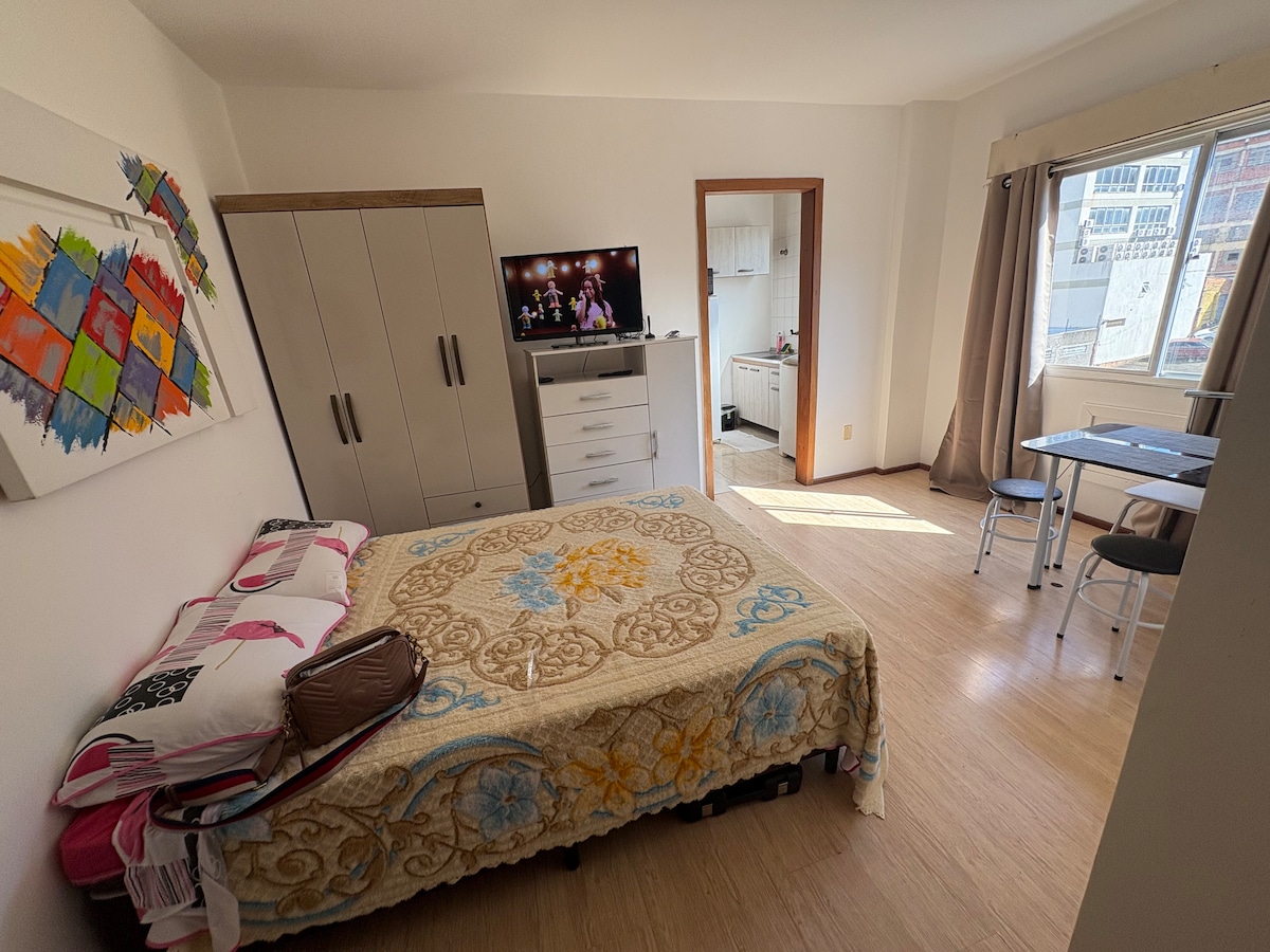 * COLCHÃO DE ALTA QUALIDADE * CHUVEIRO À GÁS * BANHEIRO EXTREMAMENTE LIMPO E HIGIENIZADO. Apartamento studio central COM SEGURANÇA PARTICULAR (19 às 7h) e câmeras no prédio. Completamente mobiliado esperando por você. Silencioso ao fechar as janelas, escuro ao fechar as cortinas. Garagem com fácil acesso e que permite caminhonetes do tipo HIlux ou Ranger Raptor Na rua gastronômica: próximo de vários tipos de lanches e de excelentes restaurantes.