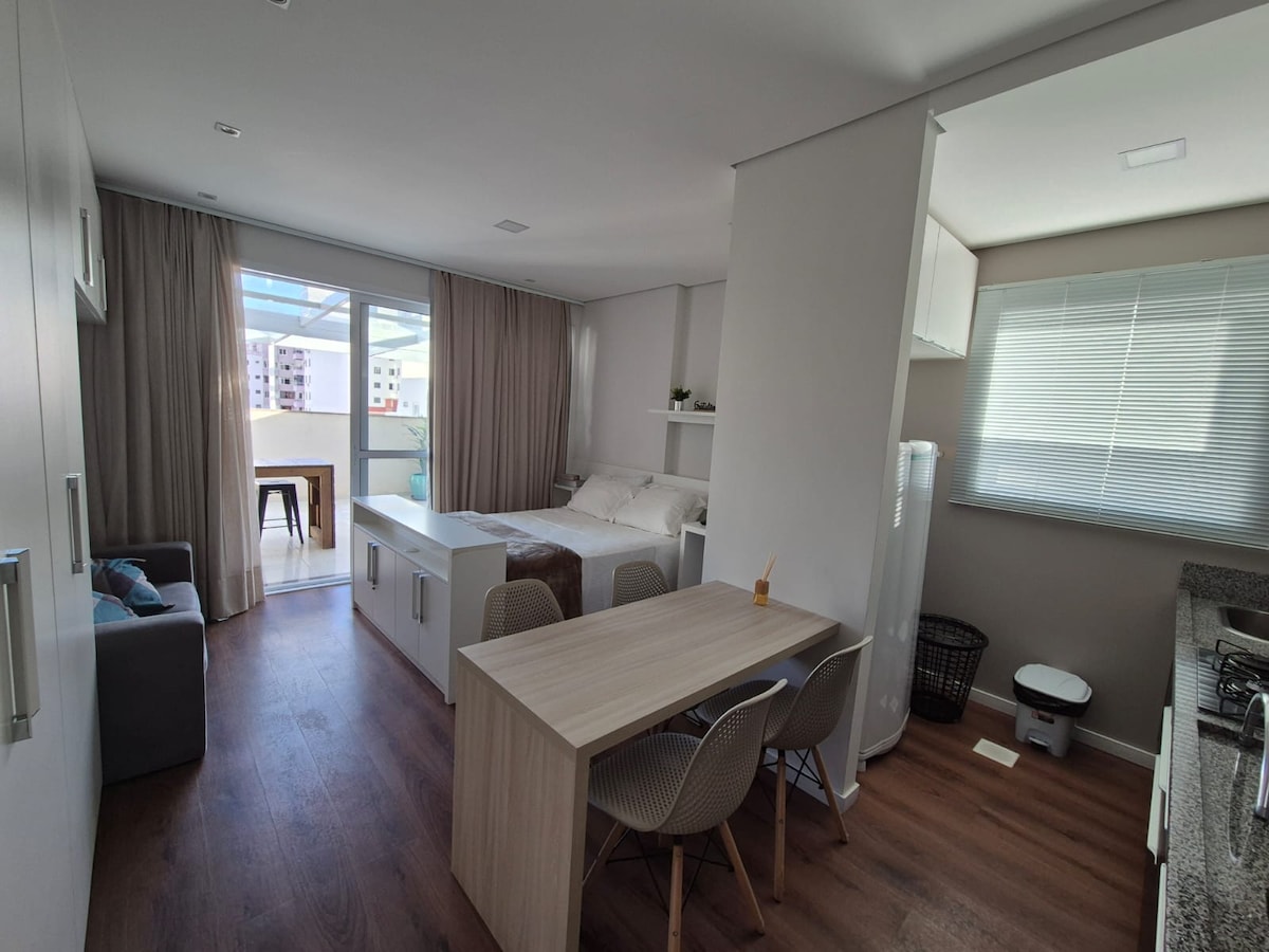 Studio super central no 17º andar em prédio novo com academia, terraço e mini-mercado. Vaga de garagem privativa, ar-condicionado, cozinha completa, lava-roupas, roupas de cama, colchão Castor, travesseiros, cobertores e toalhas. Internet privativa de 360mb com ótimo espaço de home office com mesa grande, cadeira ergonômica e monitor de 27". Muito silencio e segurança. Pontos próximos: Fleming Medicina 550m, Atitus 700m, FGV 450m. Restaurantes, farmácias e mercados a poucos metros.