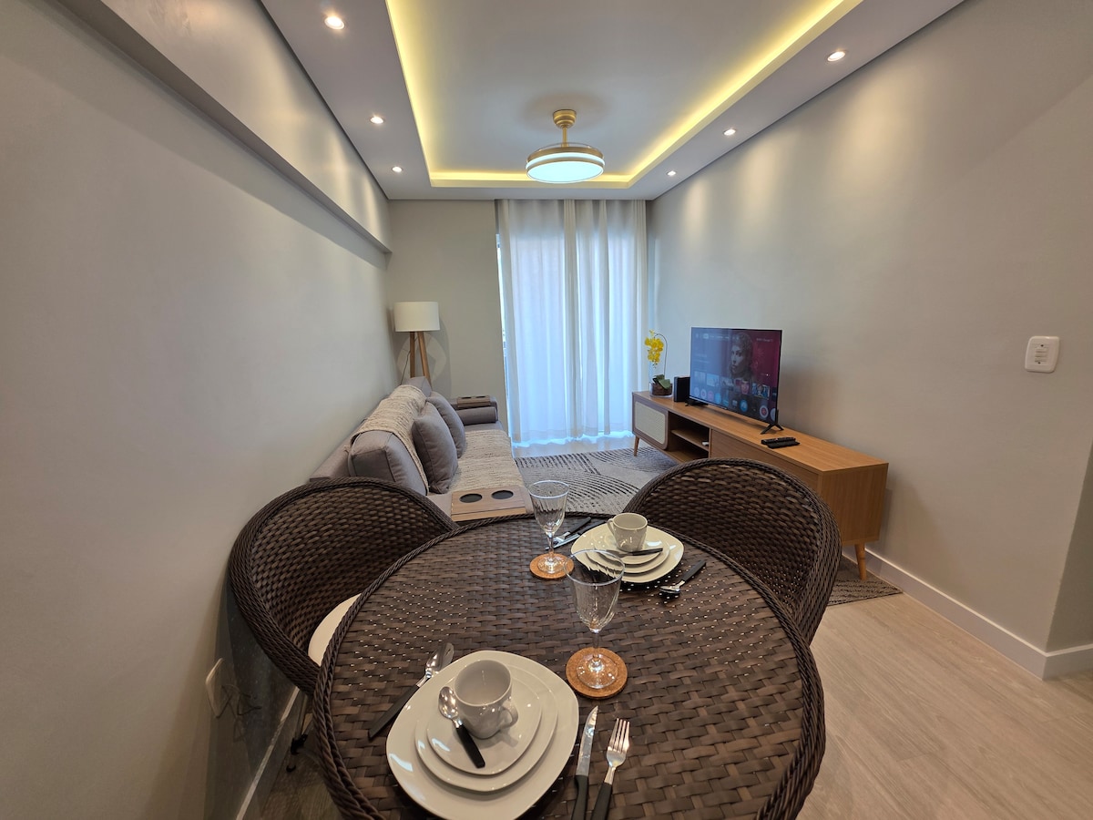 Não aceitamos pet . Portaria 24 horas. Móveis novos em MDF e granito, sofá-cama que se vira chaise, ar-condicionado ❄️, ventiladores e tecnologia de ponta como TV de 55” 📺 e internet fibra ótica. 🌐 Quartos confortáveis com tomadas nas cabeceiras. 🛏️ Banheiro com ducha higiênica 🚿 e secador de cabelo. 💇‍♀️ Cozinha completa com pratos, talheres, panelas, geladeira e lava e seca. 🍽️ Condomínio com minimercado 24h 🛒 e 1 vaga de garagem 🚗.