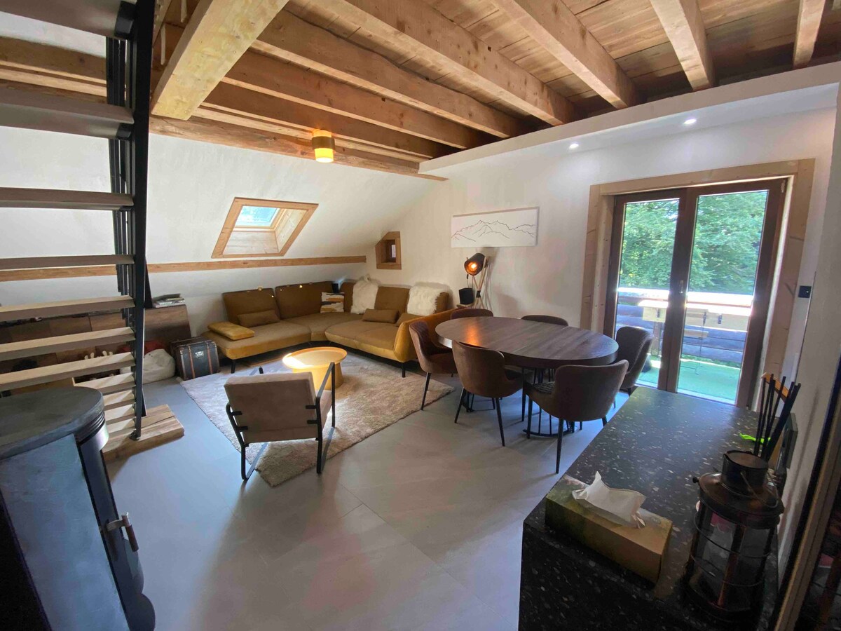 NEW LUXURY, CHARMING 2 BEDROOMS CHALET WITH EXCEPTIONAL VIEWS ON MONT BLANC, IN THE HEART OF NATURE, NEXT TO FOREST & RIVER - TWO INDEPENDANT BEDROOMS (each with its own individual bathroom). Can accomodate from 6 to 8 people with 90m2 on 3 levels - SAUNA - LARGE LIVING / DINING ROOM - ALL BEAUTIFULLY DECORATED with modern mountain Italian designed furnitures, stairs & fireplace, - LARGE TERRASSE overlooking river & facing Mont Blanc Also available for 6/8 persons. Info=Click on profile