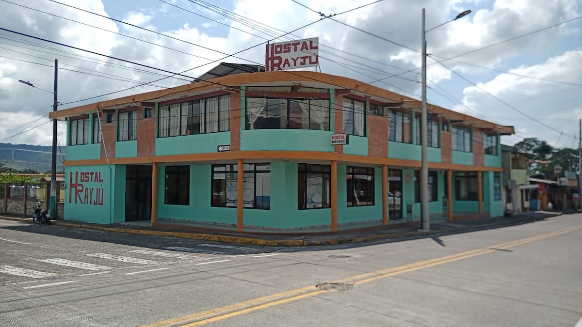 Descubra la magia de la selva tropical en el Hostal Rayjú, un acogedor refugio ubicado en el cantón Mera, provincia de Pastaza. Ventajas y atractivos que rodean al lugar: Acceso a una gran variedad de actividades: Excursiones a cascadas, observación de flora y fauna, paseos en canoa, visitas a comunidades indígenas y mucho más. Comodidades que ofrece el establecimiento: Habitaciones confortables: Amplias, limpias y con baño privado. Agua caliente las 24 horas. Servicio de Wi-Fi gratuito.