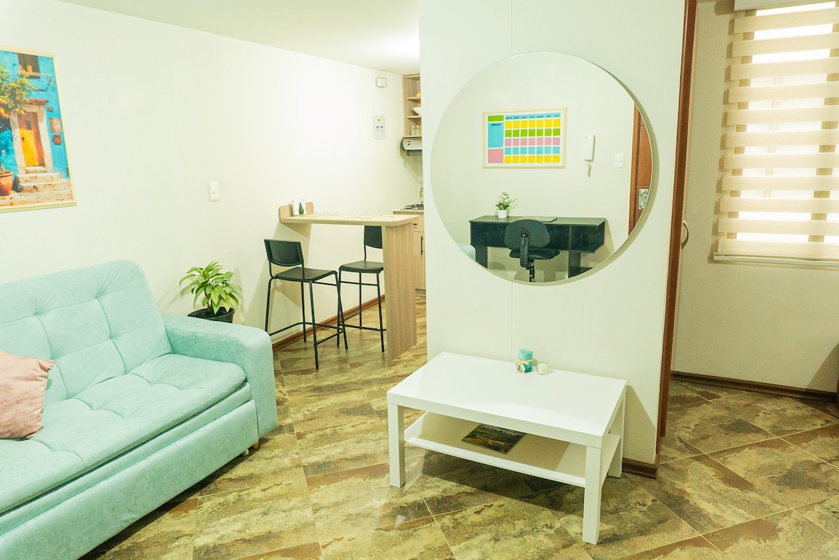 Disfruta de este acogedor y moderno Loft, diseñado para brindarle una estancia cómoda y relajante. Con un estilo contemporáneo y detalles en tonos verdes que aportan frescura, este espacio cuenta con una cama amplia, una zona de trabajo con sillas ergonómicas y una cocina completamente equipada El baño, elegante y funcional, incluye una espaciosa ducha y toallas impecables. Con todo lo necesario para sentirte como en casa. Ubicado en el centro de Pasto