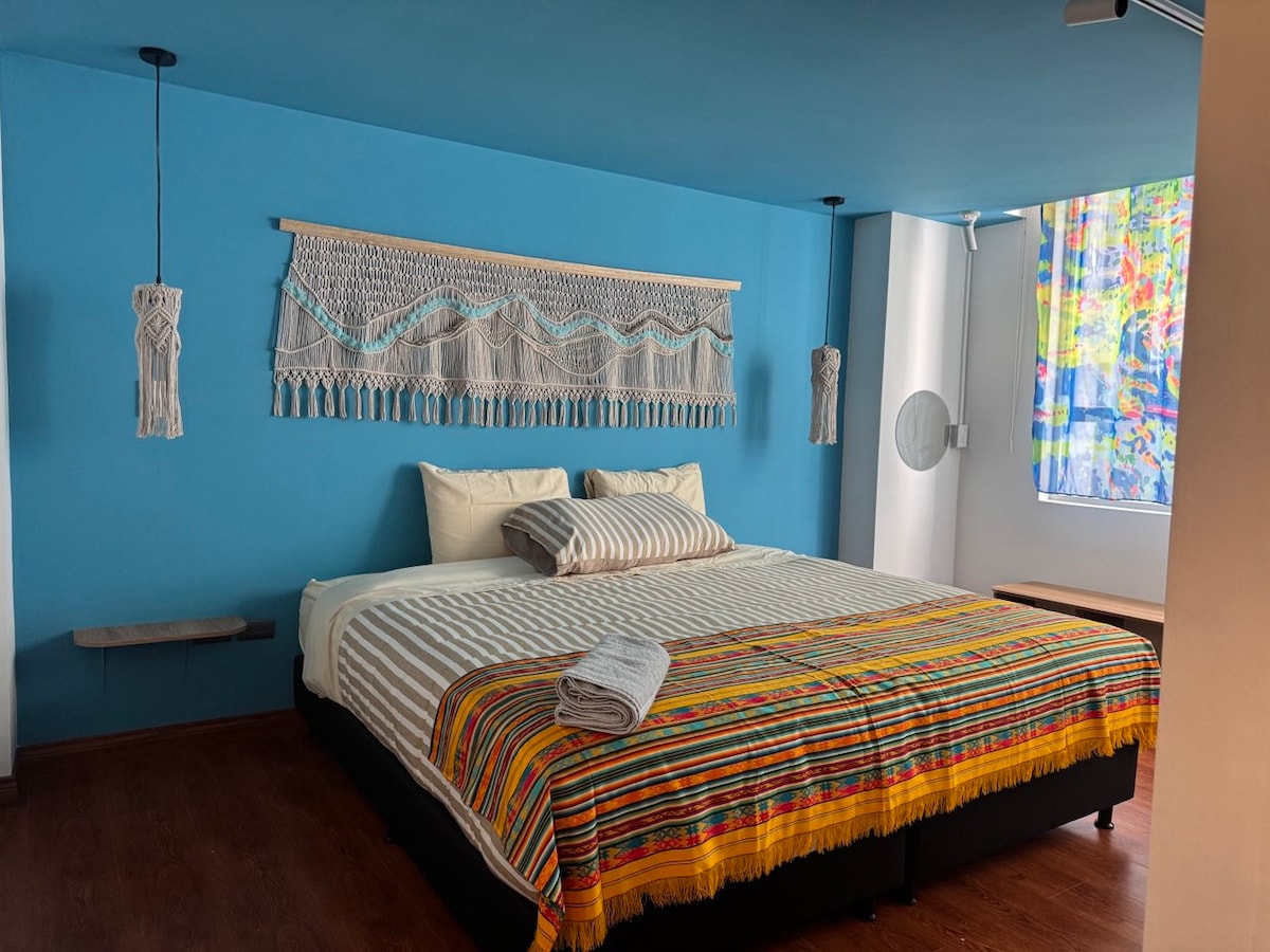 Apartment located near several restaurants. A 15-minute walk to the city center, in the San Ignacio neighborhood, just a few blocks from the Unicentro Shopping Mall. Water-themed design, high-quality beds and linens, modern building. 500 Mbps internet with a workspace, full kitchen. We don't have a TV, but we do have plenty of books and board games for you to connect with your roommates.