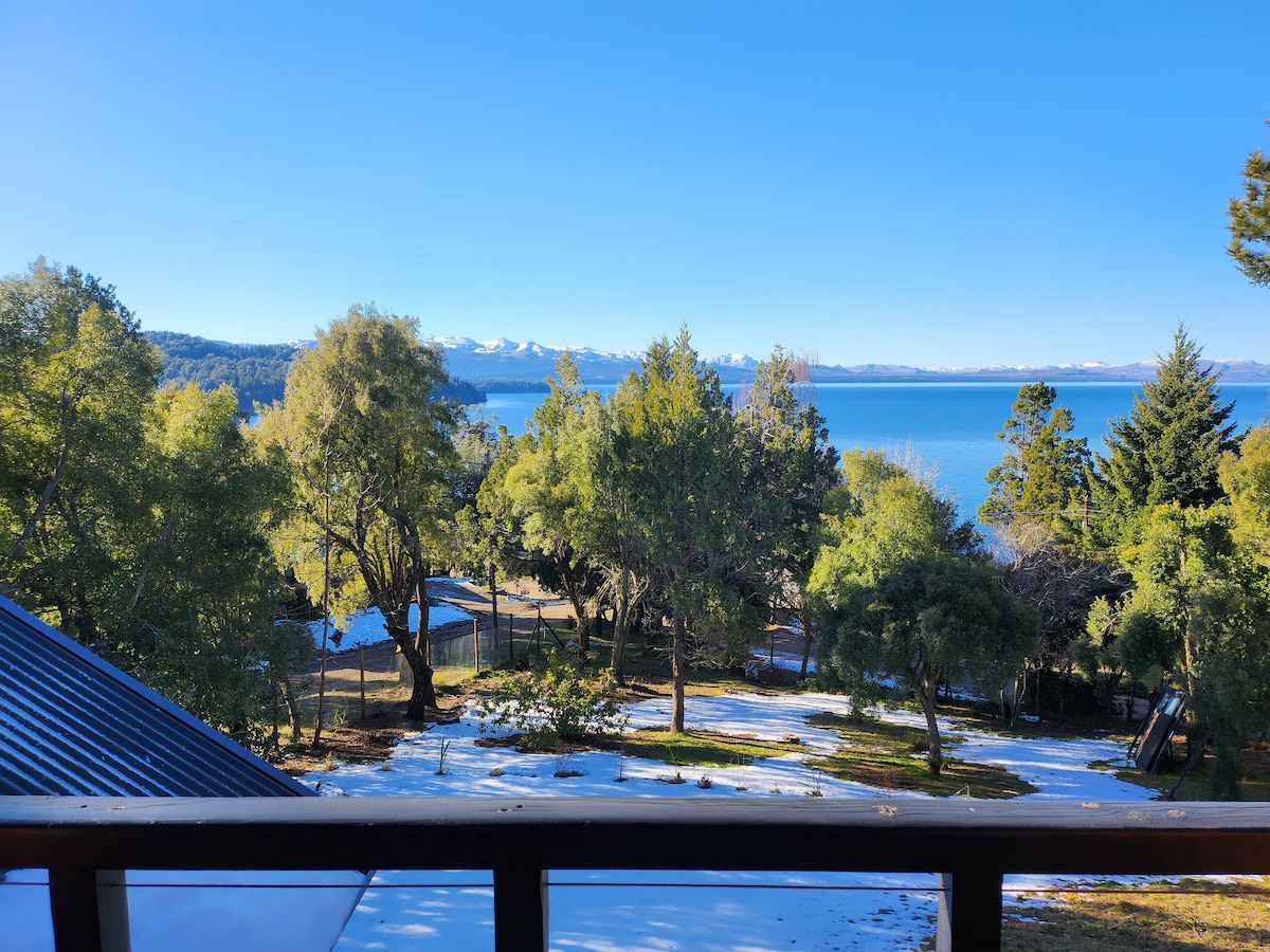 Cabaña con vista al lago y a las montañas. A pie se encuentra a 10 minutos del centro y a 150 mts del supermercado más grande de la localidad. Su arte y decoración brindan un espacio acogedor único. Su bello jardin y su deck invitan a disfrutarlos. La cabaña cuenta con habilitación municipal, contando con todas las medidas de seguridad requeridas por el ente de contralor. Para tu seguridad cuenta con cámaras de vigilancia exteriores. Un refugio para tu alma