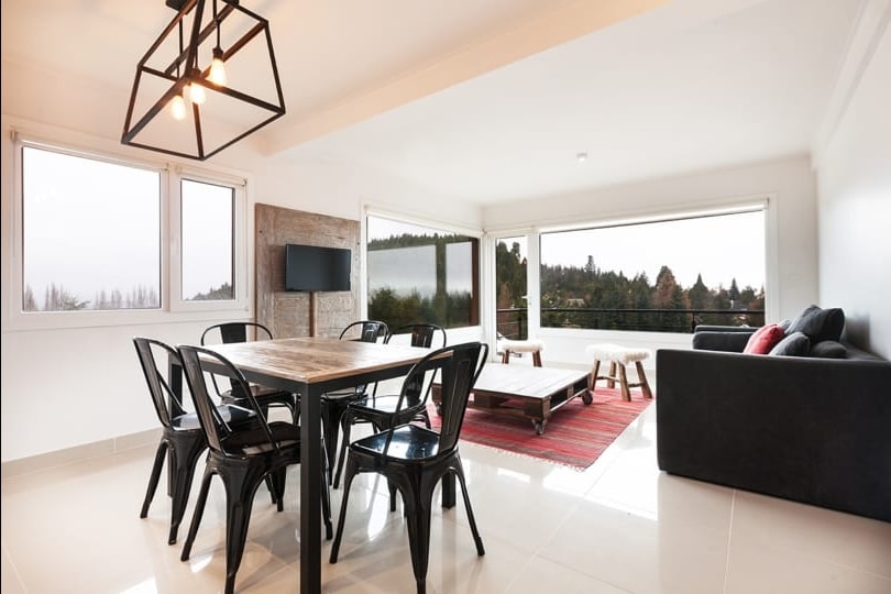 Depto de alta calidad. 2 dormitorios, totalmente equipado y de 65 m2. Living comedor y cocina completa, con insumos y artefactos de calidad (heladera, tostadora, cafetera, cocina con horno, microondas, pava eléctrica, etc) y 2 ventanales gigantes en cocina y living con una de las mejores vistas del pueblo. En cada dormitorio cuenta con sommier y blanquería de calidad, pudiendo optar por camas. 3 smart tv, wifi, etc. Muy buena ubicación, a metros del comienzo de senderos y cerca del centro.