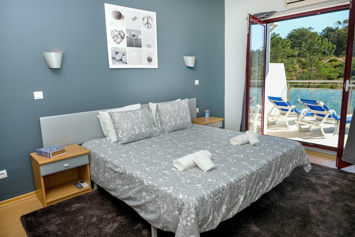 A newly renovated modern-coastal style Two bedroom apartment with spectacular views over the Atlantic Ocean and picturesque Nazaré Village and its hills, located in Sitio, a stone throw away from the Big Wave Lookout as well as Nazaré village and its beaches, whether watching the sun rise with a coffee, or the sun set with a glass of wine on the balcony you will be mesmerised by your surroundings. The apartment is perfect for couples and families on holiday, remote workers, long stays