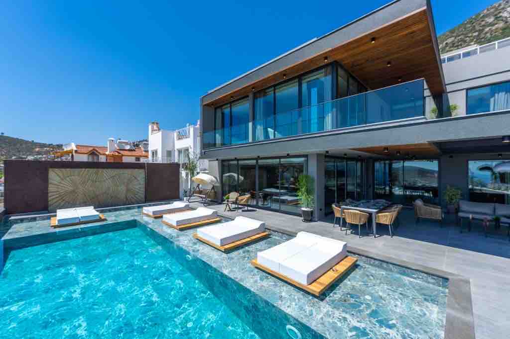 This stunning 4 bed/4 bath villa offers breathtaking views from every corner and only 5 minutes walking distance from the beach . Recognized with the 2024 top design award by the Turkish Architecture Board, it features generously sized pool, panoramic windows, luxury marble bathrooms, sauna, gym and several terraces. Located in a Kisla, a high-in-demand upscale area in Kalkan, provides a peaceful and relaxing environment.