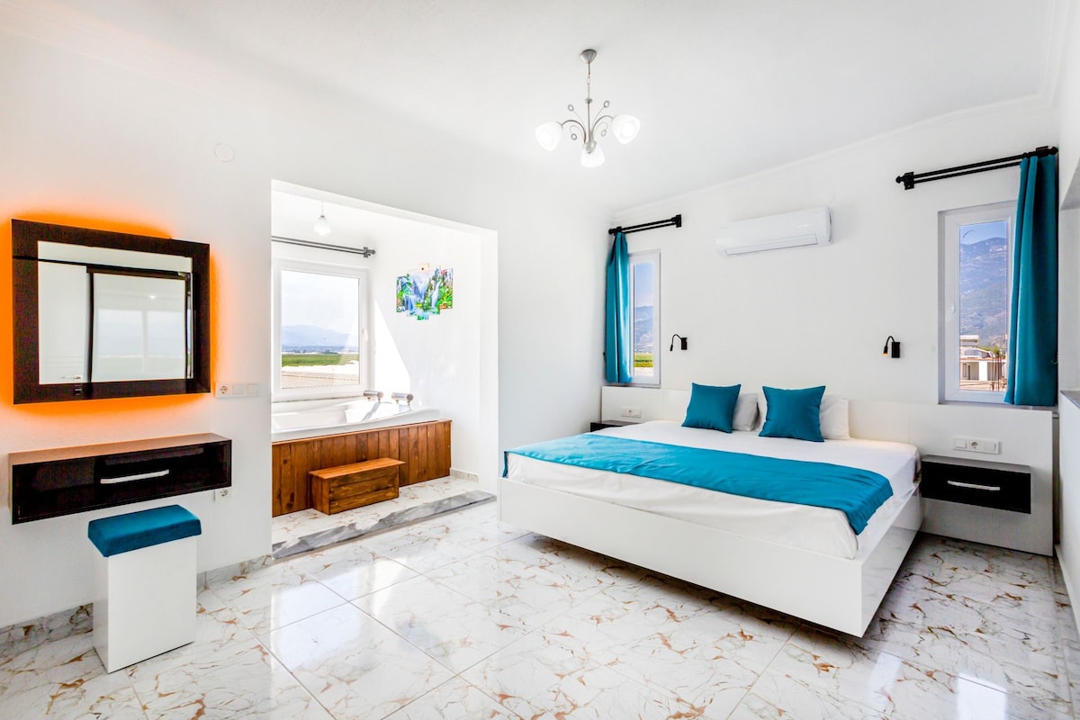 This stunning 4 bed/4 bath villa offers breathtaking views from every corner and only 5 minutes walking distance from the beach . Recognized with the 2024 top design award by the Turkish Architecture Board, it features generously sized pool, panoramic windows, luxury marble bathrooms, sauna, gym and several terraces. Located in a Kisla, a high-in-demand upscale area in Kalkan, provides a peaceful and relaxing environment.