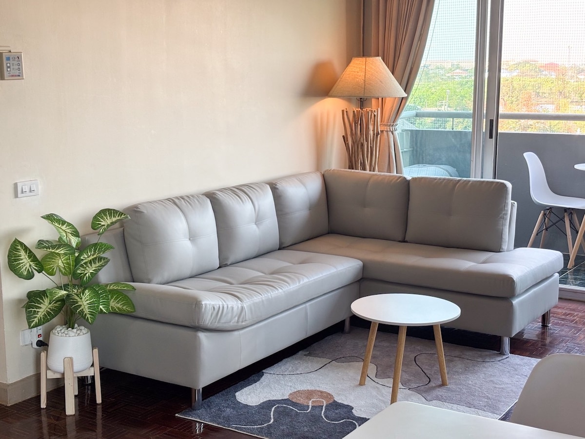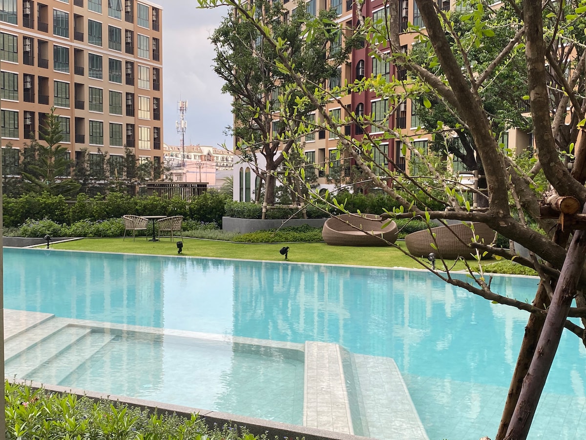 🌿Take a break and unwind at this peaceful oasis. 🌟Good for vacation and work from home. 💢Free Wifi in all area 🏡Private room in low rise condo resort style with pool 29 m, Gym,Jacuzzi, Suana, Co-Working Space, Basketball, Jogging Track and Play ground 🏕Room is for 1-3 person, equip with 1 queen bed, separate living room and kitchen. Wifi, TV, aircon, refrigerator, boiler, full kithenware, working place 🍲 5km to DMK airport and skytrain. A variety local food is all around in local price.