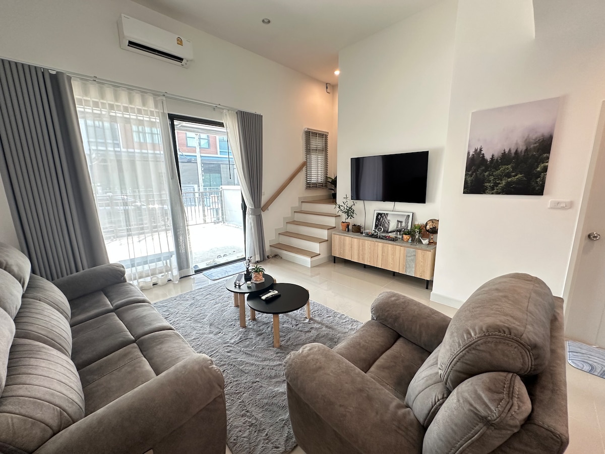 A townhome that give you peace of mind, privacy and safety near Don Muang Airport. The place that you can relax with family and friends. A 3 story townhome with comfortable living room and dining area. - 3 Bedrooms - Comfortable living room - A full kitchen - laundry area with washer Facilities: Fitness, Swimming pool, Club house and main park.