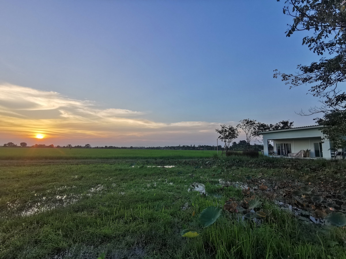 Only 1 hr drive from Bangkok, the cottage is in the middle of nature with endless panoramic view of the rice field that change with the seasons. This view captures an iconic traditional Central Thai way of life with the rice field. The cottage comes with free parking, two single beds that can be combined into 1 big bed, a pond to fish, a bbq grill and a binocular to look at birds as a perfect escape from the busy bustling city of Bangkok.