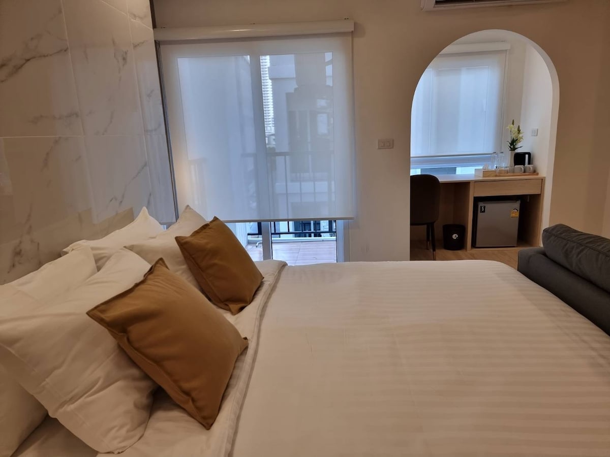 Stay in the heart of Bangkok in a comfortable quiet room. The hotel features fast free wifi, a relaxing private bathtub and wide glass screens with a great view of downtown skyline. located in Sukhumvit Soi 33, the hotel is just a 7-minute walk to BTS Phrom Phong, making it easy to explore the city’s shopping districts, cultural attractions, and lively streets. There are cafés, restaurants, and convenience stores all nearby, everything you need for a smooth stay.