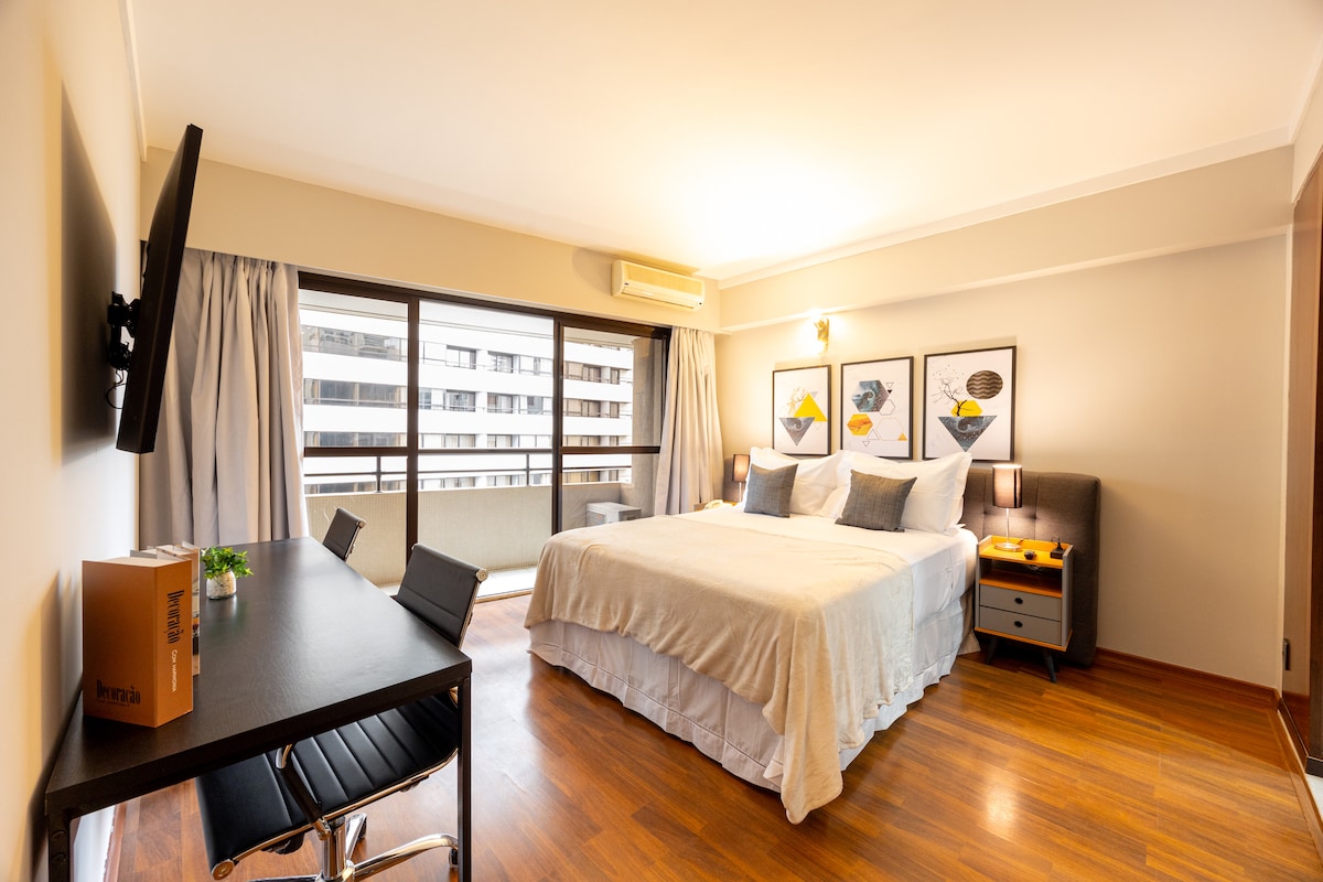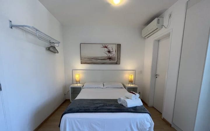 Stylish 50 m² apt. located at Bela Vista, has 24hr doorman. 2 bedrooms (only 1 with AC, and queen bed, the second one is quite small and can be used as an office, fitting a double-sized sofa-bed) and 1 bathroom. With amazing views from every window, it is a great place to work and relax. The private jet-tube at the balcony is a fantastic spot to enjoy the city views. Ideal for couples, professionals or small families looking for comfort, convenience, and one of the best views in the city.