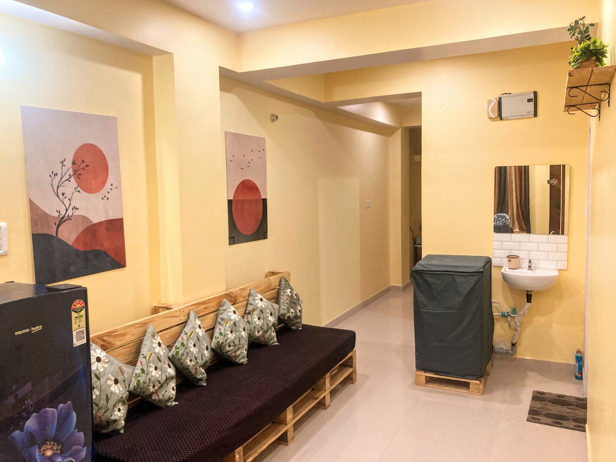 Hello! We're offering a stay in an entirely furnished, newly constructed & aesthetic 2 bhk apartment. We assure you a great stay here. ⁍ Free covered parking is available within the premises. ⁍ Easily accessible public transport as the apartment has access to the main road. ⁍ Ola, uber and Rapido remain readily available here. ⁍ Swiggy instamart, Jio mart and blinkit are available for delivering groceries. ⁍ Swiggy & zomato are there for delivering food.