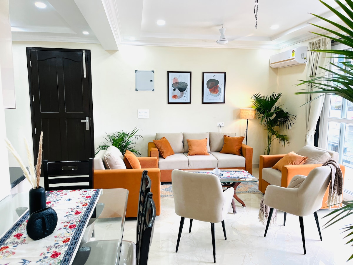 These 1bhk Ac home with open kitchen, big balcony and attached bathroom with natural lighting What You’ll Love: •Spacious air-conditioned bedroom •A large private balcony with a dining setup, perfect for relaxing or working with a view •Fully equipped open kitchen with stove, utensils, fridge, and water purifier •Attached bathroom with natural lighting, and toiletries •Beautiful rustic wooden ceiling and traditional interiors with a cozy vibe •Pet-friendly your furry friends are wellcome