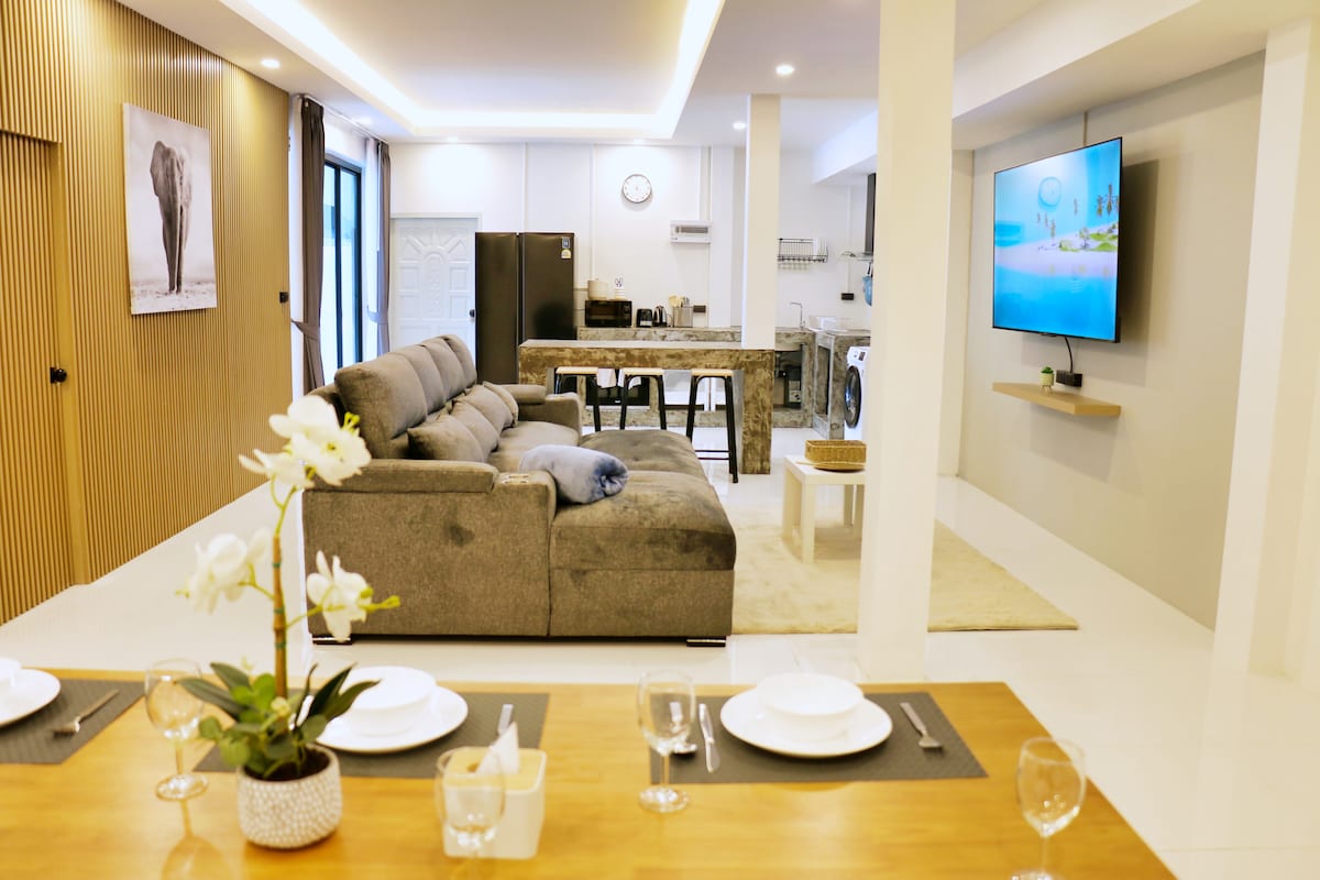 别墅在建造时设计师巧妙地利用了当地山丘的地形来建造,这意味着您在客厅、泳池、房间里都可以俯瞰整个芭东海湾。和你的爱人依偎在泳池旁,听着浪漫的歌曲,品着红酒,欣赏海湾的落日晚霞和港湾夜景。或是悠闲的看一本书品尝着咖啡感受着微风轻拂,聆听大自然的声音。从别墅到芭东海滩和购物中心,班赞海鲜市场只需要5分钟。到海上大象营地和丛林穿越营地,国家森林公园只要8分钟。2间卧室,每间都配有独立的卫生间和浴室,配备了一张特大号床,位于同一楼层。开放式厨房配备了欧洲电器,非常齐全。有一个可容纳6人的用餐区,与客厅相连。客厅直接通向户外景观甲板和私人泳池,提供了另一个享受海景的理想场所。您还可以乘坐电梯直接到达顶层的露台,享受日光浴和美丽的景色。我们的别墅有一棵高耸的树,它自然生长,形状独特。它非常雄伟,让您感受到大自然的伟大和神奇。别墅提供停车位供您停放汽车或摩托车。距离别墅500米有一家餐厅制作的西餐,披萨和泰餐味道都相当美味,餐厅在营业时间支持外送,隔壁还有一家咖啡厅和一家酒吧,再走200米还有一家便利店日常需要都可以满足