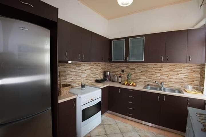 Surrounded by olive trees and with a breathtaking panoramic view, this solar powered house will not cease to surprise you! Kitchen and living room are not separated by any wall and this creates an open and comfortable environment. We grow our food in an organic way and we have 8 chickens and 2 goats, which provide us with fresh milk and eggs every day. So don't waste your time in crowded resorts and boring apartments. Come stay at our home, meet our charming goats and experience something new!