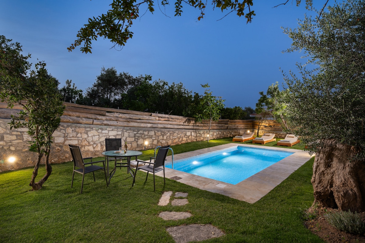 A fully renovated, stonebuilt compound built on top of three ancient greek grottos. It used to be a Venetian olive press factory. Now it's a contemporary holiday home with two pools (indoor and outdoor) and an organic vegetable and local fruit garden