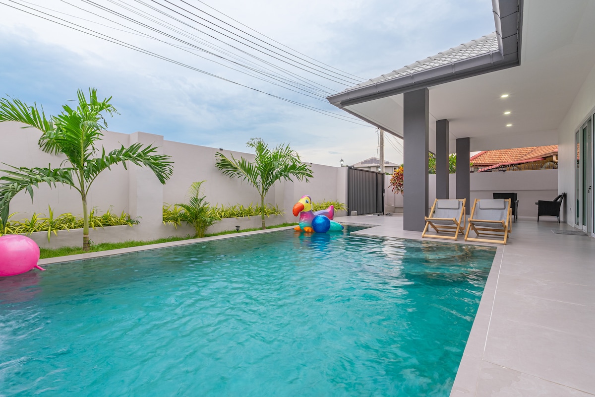 房源概况 这栋独栋泳池别墅位于芭提雅中天区域,设有 四卧五卫,每间卧室均配备独立卫生间,保障客人私密性。别墅全新装修,空间宽敞明亮,配有独立庭院与私人泳池,可舒适容纳 8–10人,非常适合家庭、朋友聚会或团体度假。 地理位置 别墅距离 中天海滩约800米,步行即可到达。小区周边 300 米内拥有餐厅、咖啡店、药店和便利店,生活便利。驾车可快速抵达主要景点: • 5分钟:中天夜市、周末夜市 • 10分钟:Central 百货、唐人街、Terminal 21、79 成人秀 • 15分钟:步行街、格兰岛码头、美人鱼网红餐厅 无论是海滩、购物还是夜生活,都能轻松安排。 房屋亮点 • 四间卧室均为独立套房 • 五个卫生间,多人入住也不拥挤 • 私人泳池与花园,定期维护 • 超大客厅和餐厅,适合聚餐和休闲 • 全屋空调、高速 Wi-Fi • 社区安静、安全,适合家庭入住 管家服务 提供 24小时管家服务,协助入住指引、路线导航 可选增值服务 提供曼谷/芭提雅接送机、包车服务、租车、包船出海、景点及秀场门票预订、私厨上门、上门烧烤、翻译等服务,让假期更加便利和轻松。