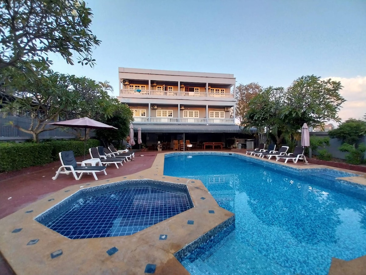This is a bungalow in the grounds of a large house with a mature garden, swimming pool and shallow kids pool area. King size bed, with a sofa bed. The room has an ensuite bathroom for sunlight to shine through. Very big garden. Located in a great area, 10mins away from the beach, Jomtien airport bus & foodmart is next door and restaurants such as PanPan are across the road. Very close to the activities in city center. Maid service for free. We are owners of a weed cafe, so please ask!