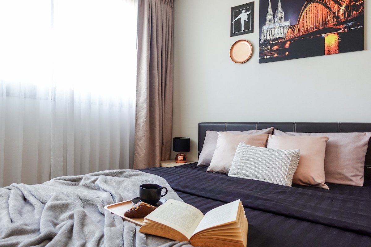 60 sq. m. room with 2 bedrooms, 2 bathrooms, and 1 kitchen - King-sized bed comfortable for 2 people (with a private bathroom) - Queen-sized bed comfortable for 2 people - A regular sofa for 1 more person - A private bathtub in the balcony section - Towel and bathroom items provided - refrigerator, stove, microwave, electronic kettle - pots and pans, dishes, cutlery, cups, wine glasses - smart TV (access to apps like Netflix & Youtube Premium) - High speed internet (500/500 Mbps)