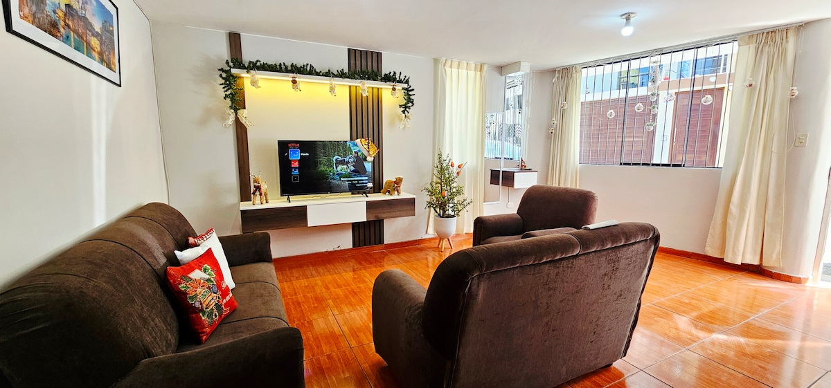 Encantador departamento seguro y cómodo de 45 m² para 2–3 personas. Dormitorio con 2 camas de plaza y media y Smart TV; sala-comedor con Smart TV; cocina equipada con barra; baño completo con agua caliente y comodidades. Internet rápido, plancha y clóset amplio. Piso 5 con ascensor y seguridad 24 h. A 10 min en taxi de la Plaza de Armas.