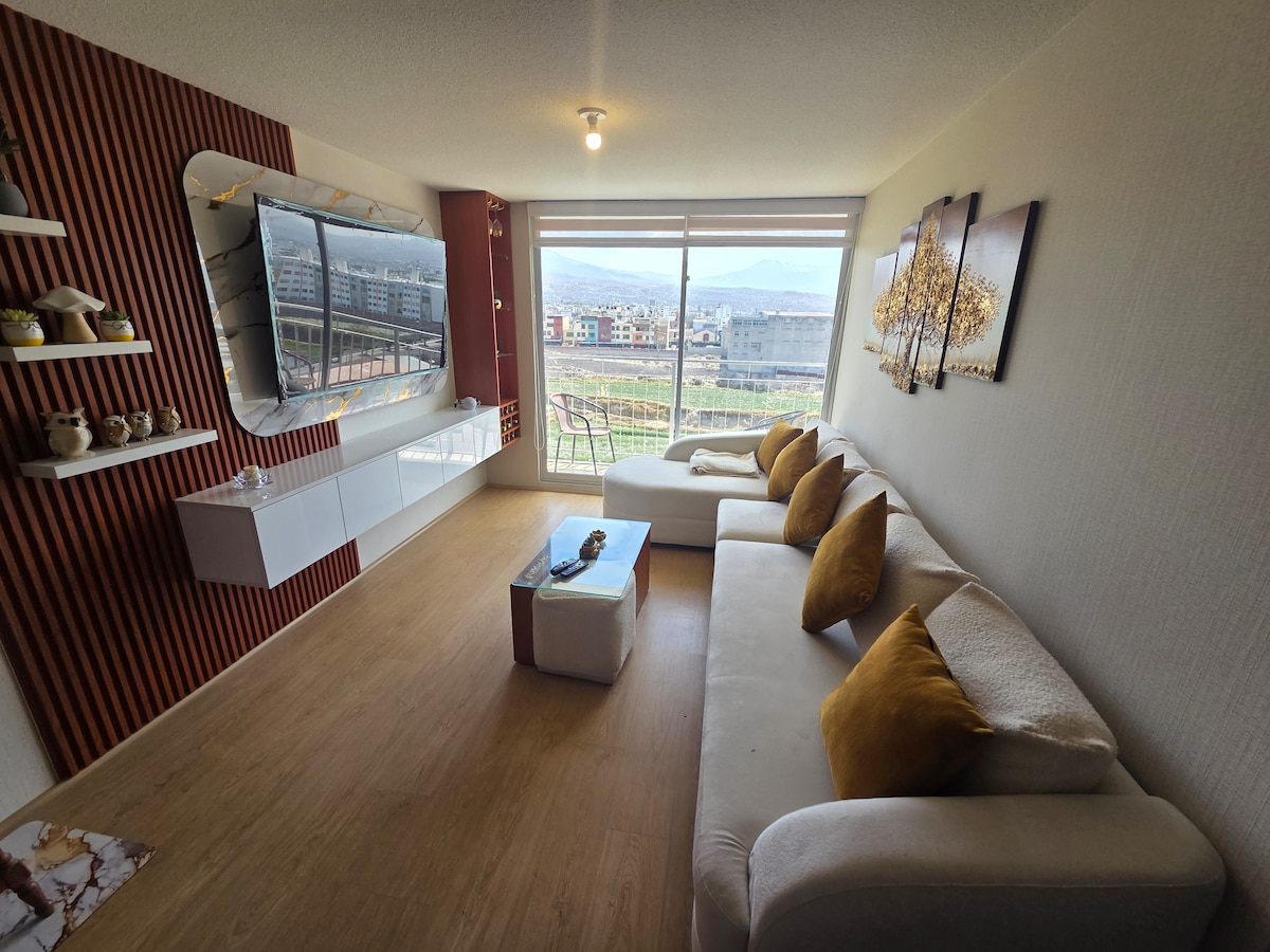 Este moderno y acogedor departamento es perfecto para la comodidad y tranquilidad. Disfruten de un espacio amplio y funcional con una sala espaciosa para relajarse, dos televisores equipados con Disney+ y Netflix, una cocina completamente equipada para preparar deliciosas comidas. Cuenta con un cómodo comedor y 2 baños modernos. Zona tranquila, cerca al Mall Aventura Plaza, a 20 min del centro. La ubicación es ideal para explorar Arequipa mientras disfrutan de un refugio sereno para descansar.