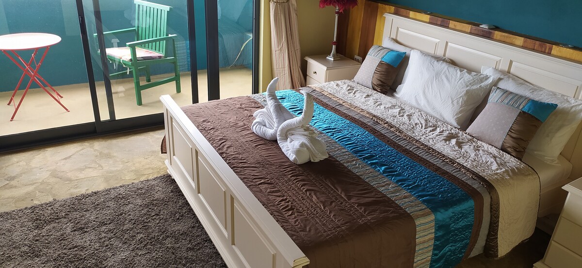 This spacious room offers a coffee/tea corner with a fridge and a sitting area furnished with a comfortable sofa. The unit includes a shared balcony. While the room itself does not have valley views, guests can enjoy the panoramic scenery from our rooftop terrace. The room is shaded by a large mango tree. This means it is on the darker side, but it keeps the room pleasantly cool during warmer days. One window opens onto the hallway, though we have installed a privacy screen for your comfort.