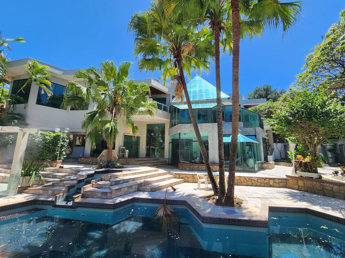 High standard accommodation in a European mansion style with five suites and two bedrooms, all with beds, linens and towels for 23 people,. Option of an additional small house with two bedrooms, living room, kitchen and bathroom for four more people(check additional cost) Thermally insulated property, 700m2 of construction, several balconies, and two terraces in the upscale and safe neighborhood of Barão Geraldo, in the countryside of Campinas Vivo fiber 500Mb and JBL Partybox 320 sound system