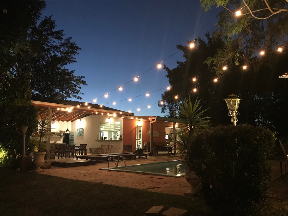 Natureza e ótimas acomodações. 5mil m2, churrasqueira grande e coberta, 2 piscinas, campo de futebol, Beach tênis e vôlei, fogueira, parquinho, pomar, estacionamento e Wi-Fi. A casa passou por grande reforma, é avarandada, sala de visitas e de jantar, duas cozinhas (uma com bar p a sala, uma na churrasqueira). 5 suítes: duas dentro da casa e 3 chalés/suítes externos, com privacidade total. Perfeito p/ festa infantil, churrasco familiar com Respeito à Lei do Psiu. Mínimo de 2 diárias.