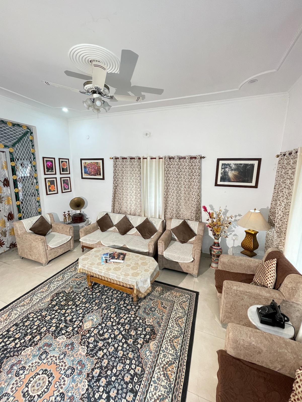 4 King size beds with spring mattresses ensuite bathrooms, 2 living rooms one with a 55" smart TV, a loaded kitchen and a kitchenette, We welcome you to this cozy, centrally located and spacious house in Dalanwala Dehradun, walking distance from the EC Road and minutes from Race Course. It has balconies overlooking big silver Oaks and a bunch of other trees. Welhams and Doon International School are just a walk away! All necessary amenities under one roof so that you can feel at home.