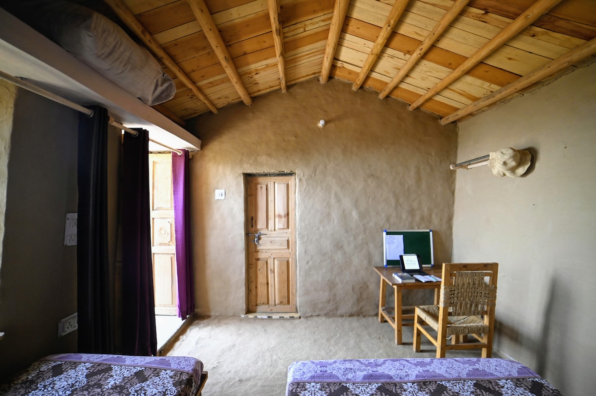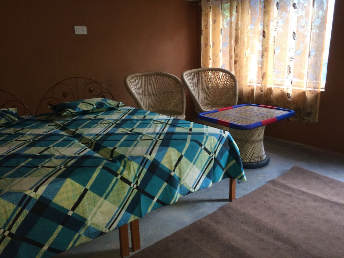 Set in lush green surroundings you will get a farmhouse feel with beautiful gardens and orchards. In the garden we have many fruit trees and seasonal organic vegetables. It is a ground floor unit with one small bedroom along with a private kitchen, a bathroom along with a private verandah where the guests can sit and enjoy nature while sipping on hot tea. It is a perfect fit for solo travelers on a budget.