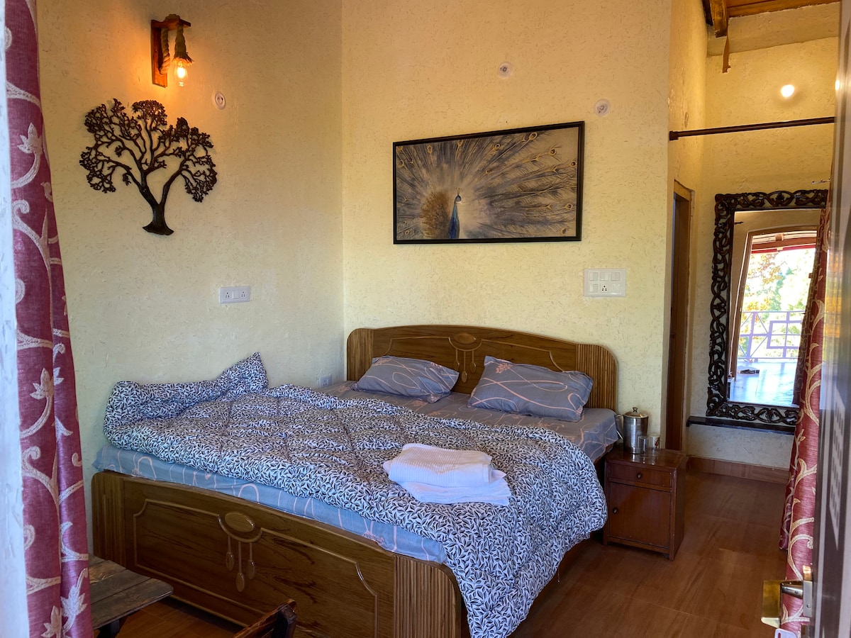 Set in lush green surroundings you will get a farmhouse feel with beautiful gardens and orchards. In the garden we have many fruit trees and seasonal organic vegetables. It is a ground floor unit with one big room. There is one kitchen and one bathroom. There is a private sitting area at the entrance where the guests can sit in and enjoy nature while sipping on hot tea. We also provide freshly prepared pure vegetarian home cooked meals (pre ordered at a nominal cost).
