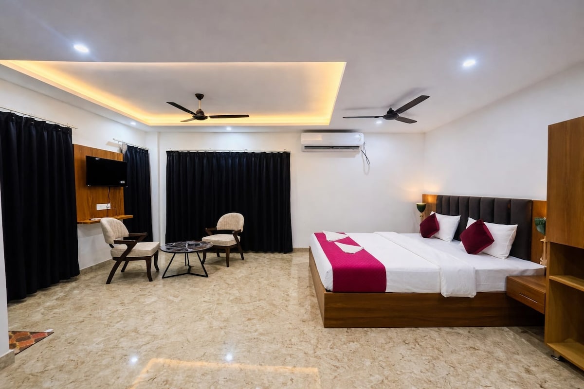 Experience luxury and comfort at its finest in our Deluxe Room at Prashant Retreats. Step into a spacious oasis that offers a serene ambiance and modern amenities, perfect for both business and leisure travelers. The room boasts elegant decor, creating a calming atmosphere for a peaceful stay. Indulge in a restful night's sleep on the plush king-size bed, and wake up to stunning views of the surrounding landscapes.