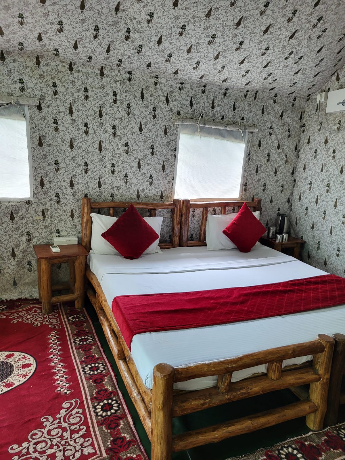 5 luxury tents, styled in a way to provide you the best stay with modern facilities like free WiFi, tea/coffee maker/ air conditioning etc. Each tent has a private porch with a view of pool, lawn area and sal trees. Enjoy the sounds of nature when you stay in this unique place.
