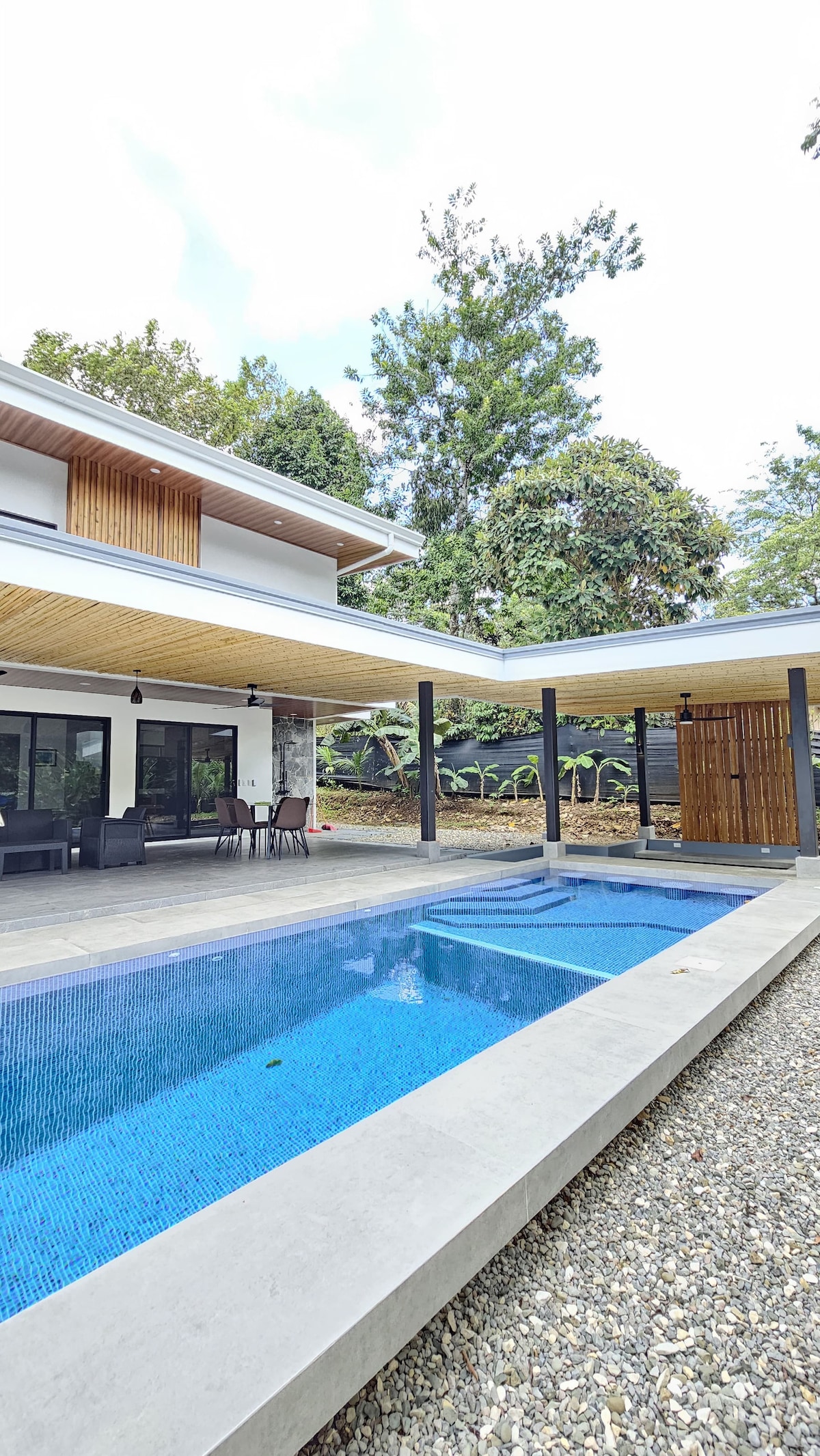 Exclusive villa with private pool that combines modern and comfortable design with the natural beauty of Costa Rica. Ideal for two people, expandable to accommodate up to four guests. Located in the village of Pavones, in a quiet neighborhood, just an 8-minute walk from Pavones point break. Fast Wi-Fi throughout the property. Spacious suite bedroom, private bathroom, walk-in closet, surfboard rack, and AC. Living and dining area with two large sofas, home cinema projector, and bathroom.