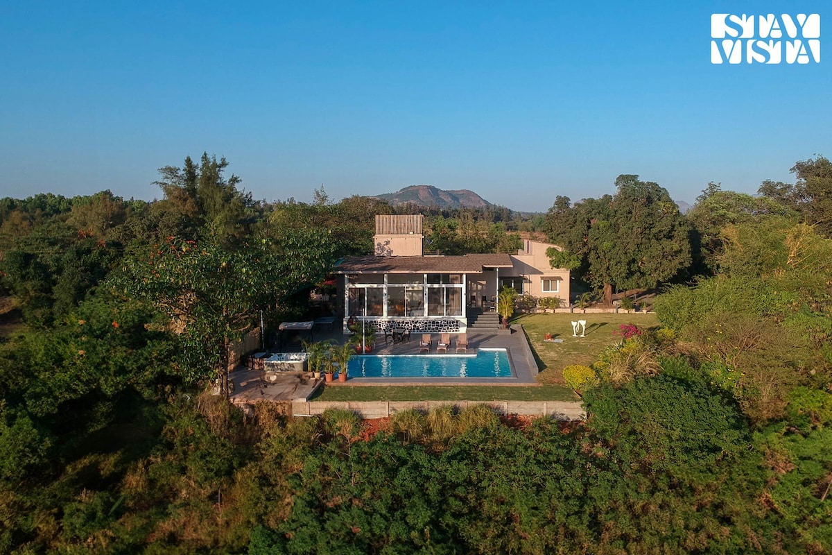 'Villa Elsewhere' is a luxurious, beautiful, private pool villa, just 60-90 mins drive from Mumbai. Surrounded by lush green views of fields, hills, and sounds of nature. The Villa has 3 AC en-suite bedrooms, a large AC living room that opens into a private pool and large deck with a Bar. The kitchen is fully equipped where a chef can make delicious meals (*extra charge). It is pet friendly (*extra fee). BOOK to relax in a calm peaceful vibe, for a get together, or to host the best part ever!