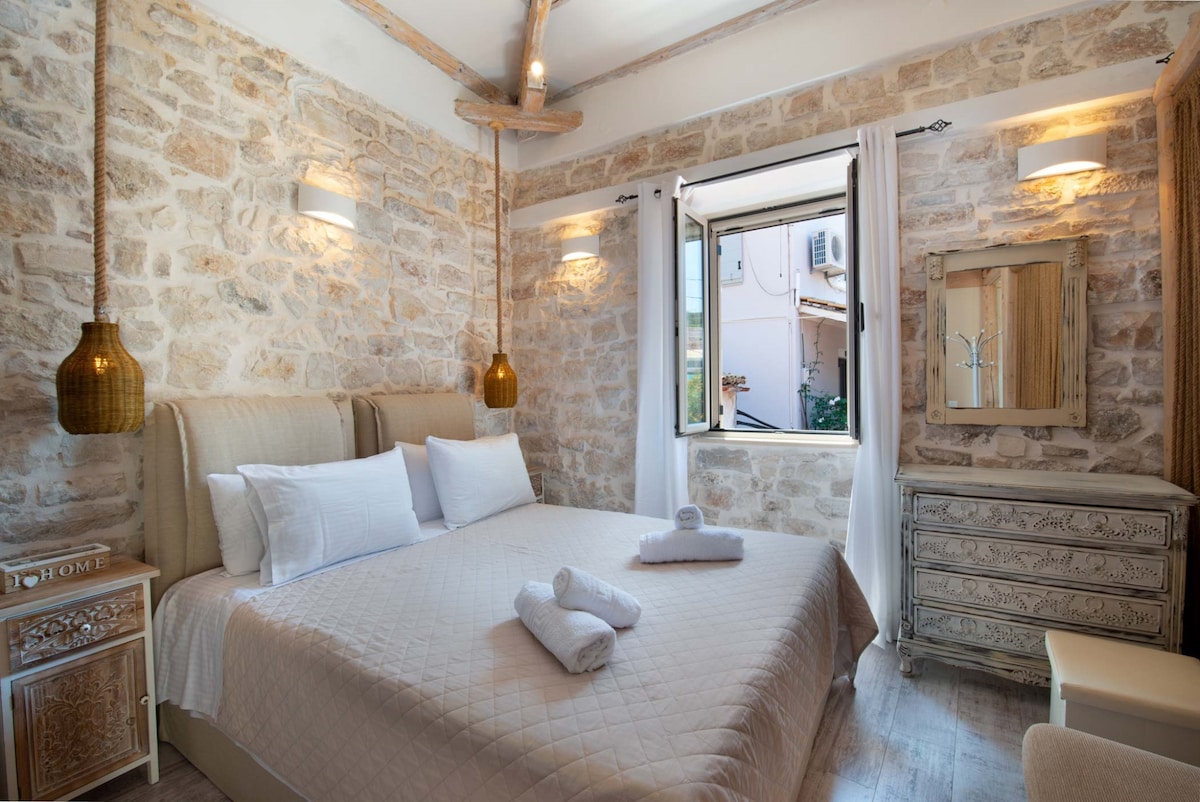 This brand new stone house manages to blend a mix of traditional and neoclassic styles into the perfect vacation "maison".Its open space layout is ideal for families while its size alone makes sure that you will feel spoiled.On a total of 165 m2 there are 2 very spacious bedrooms and two full bathrooms on the top floor and an open plan full kitchen, dining room,living room,office space and bathroom on the ground floor. It is possible to rent it together with a separate cottage for 2 extra people