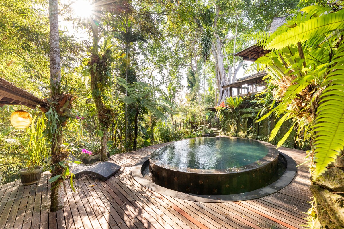 Hidden Ubud Gem! Enjoy our brand-new Infinity Pool (measures 10 m x 4 m), which is shared by three cabins on our expansive property, including our cooking school. Our original Tresna Bali Cabin - a unique local treasure which we reassembled piece by piece in our garden and added a luxurious bathroom. You’ll experience village life waking up to roosters under intricate Balinese wooden rafters. If you prefer more privacy and spectacular views, book our Riverview or River Valley View cabin.
