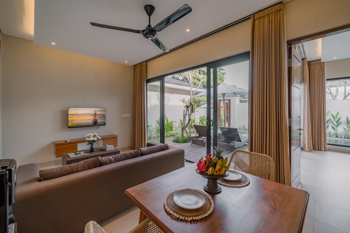 Stay "Centre Front" in this Spacious One bedroom Villa overlooking the surf breaks and Lagoon all the way to Mt Agung in Bali. Our Villa is about reconnecting with each other. Taking the time and having the space to enjoy yourselves. You will have an Exclusive pool right off the Loggia area and a private sundeck, Bistro table, kitchen facilities and a huge bathroom. The bedroom has Aircon for comfort at night. 70 sq.M of private space. Renovated February 2023
