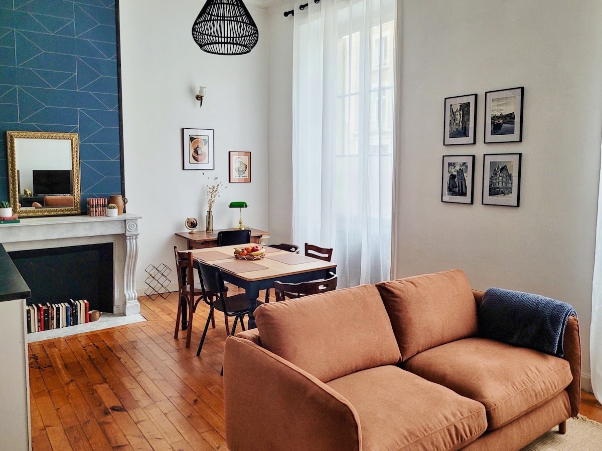Profitez pleinement de cet appartement traversant et lumineux à la décoration soignée, rehaussée par la chaleur du bois. Parfaitement équipé, il possède une chambre donnant sur un jardin pour des nuits sereines. Possibilité de parking privé 25€/jour au lieu de 50€/jour dans la rue.