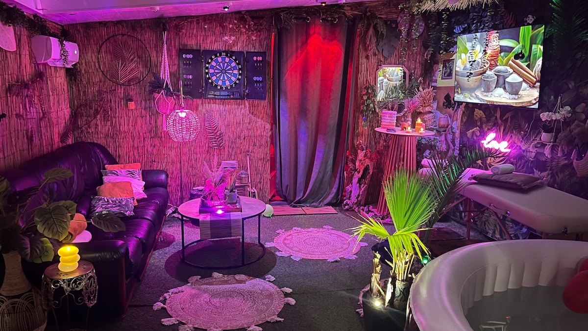 ✨ Découvrez le Mirage Tropical , une parenthèse raffinée au bord de la Loire 🌴. Profitez d’un Spa , Table de Massage d’une terrasse élégante et d’un espace jungle dépaysant pour vous évader. Amusez-vous autour du jeu de fléchettes, partagez un apéro exotique ou détendez-vous dans une atmosphère unique. Le soir venu, la chambre s’illumine de couleurs envoûtantes pour un moment chic et romantique 💖. Ici, chaque détail sublime votre séjour pour créer des souvenirs mémorables.🌴❤️❤️💕💕💕👄🫂❤️