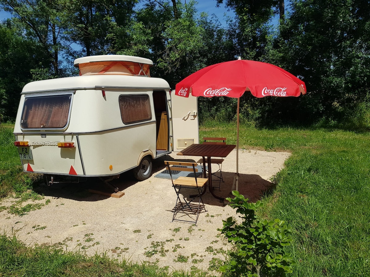 Idéale pour un séjour romantique, installée dans un écrin de verdure au bord du petit étang, cette caravane vintage de 1972, saura vous séduire avec sa vue panoramique, sa terrasse privée équipée d'une cuisine d'été, sa douche et toilettes intégrés. Equipée tout confort, elle est installée sur un terrain arboré de 2 hectares auprès de ma fermette. Venez découvrir nos animaux et nos espaces extérieurs. Jacuzzi partagé à l'abri des regards dans le jardin d'hiver.