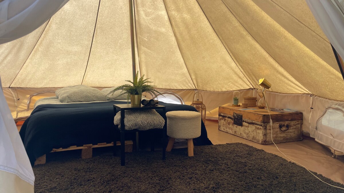 Laissez-vous bercer par les sons de la foret et du cours d'eau, dans ce logement unique. Ce camping de haut standing vous charmera par son confort mais surtout par son cadre naturel d'exception. Tente de 20 m2 avec un vrai lit de 160 dans une ambiance bohème feutrée. Sanitaire privatif. Petits déjeuners inclus.Un brasero est à votre disposition (hors période de sécheresse), pour de douces soirées. Un accès d'une heure au jacuzzi principal du domaine peut-être ajouté en option pour 20€.