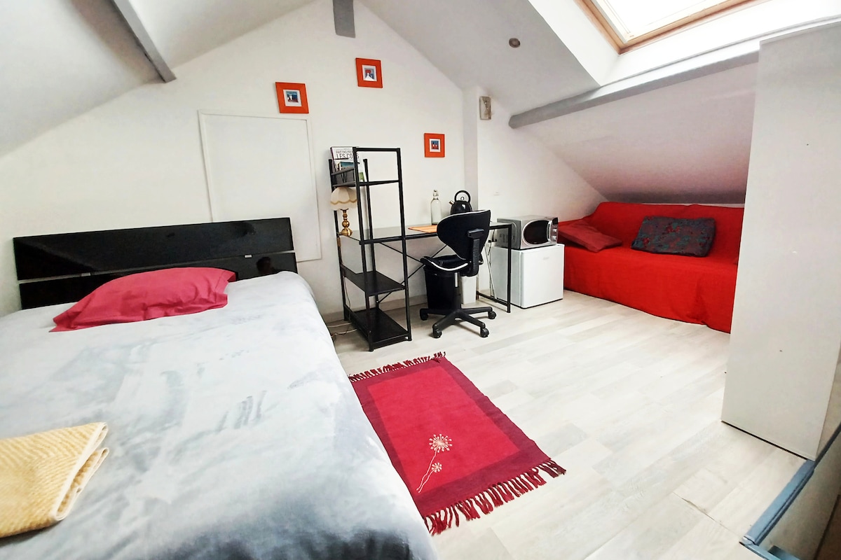 Nous mettons à disposition un studio très lumineux avec chambre, bureau, salle de bains privée et coin repas. L'accès au logement est totalement indépendant. Vous pourrez vous garer facilement et gratuitement dans la rue. Le coin repas se compose d'un réfrigérateur, d'un micro-ondes, d'une bouilloire et de vaisselle (assiettes, bols, verres et couverts, thé et café). Vous pourrez donc réchauffer des plats, préparer un petit déjeuner mais pas cuisiner. Je fournis les draps et serviettes.