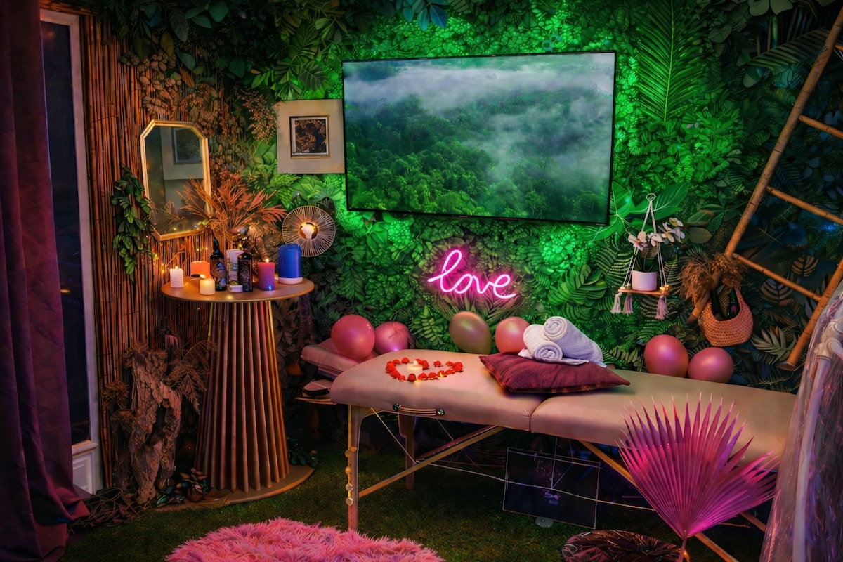 ✨ Découvrez le Mirage Tropical , une parenthèse raffinée au bord de la Loire 🌴. Profitez d’un Spa , Table de Massage d’une terrasse élégante et d’un espace jungle dépaysant pour vous évader. Amusez-vous autour du jeu de fléchettes, partagez un apéro exotique ou détendez-vous dans une atmosphère unique. Le soir venu, la chambre s’illumine de couleurs envoûtantes pour un moment chic et romantique 💖. Ici, chaque détail sublime votre séjour pour créer des souvenirs mémorables.🌴❤️❤️💕💕💕👄🫂❤️