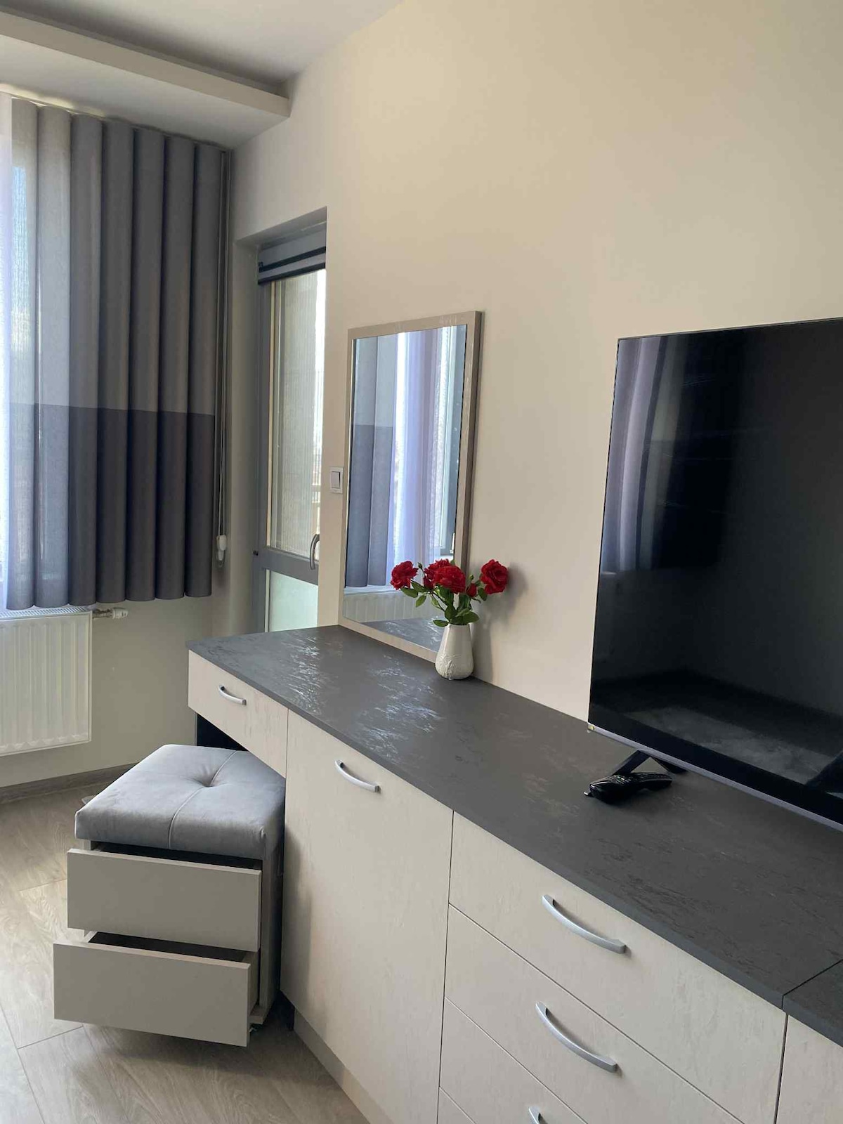 Luxury apartment, located in the center of Pazardzhik city. The building has an elevator, a patio and Non stop market. Located near Lidl and other shops, gaming halls, pharmacy and free parking on the street. The apartment has dinning room with washing machine, fridge, built in-oven and hobs, aspirator, table with four chairs and balconies. The living room has sofa bed, coffee table and smart TV. The bedroom has comfortable bed, dresser, wardrobe and smart TV. Quite place for vacation or work.