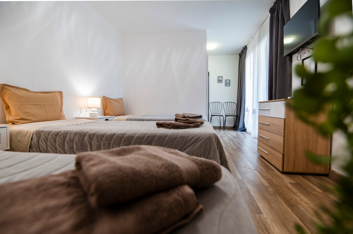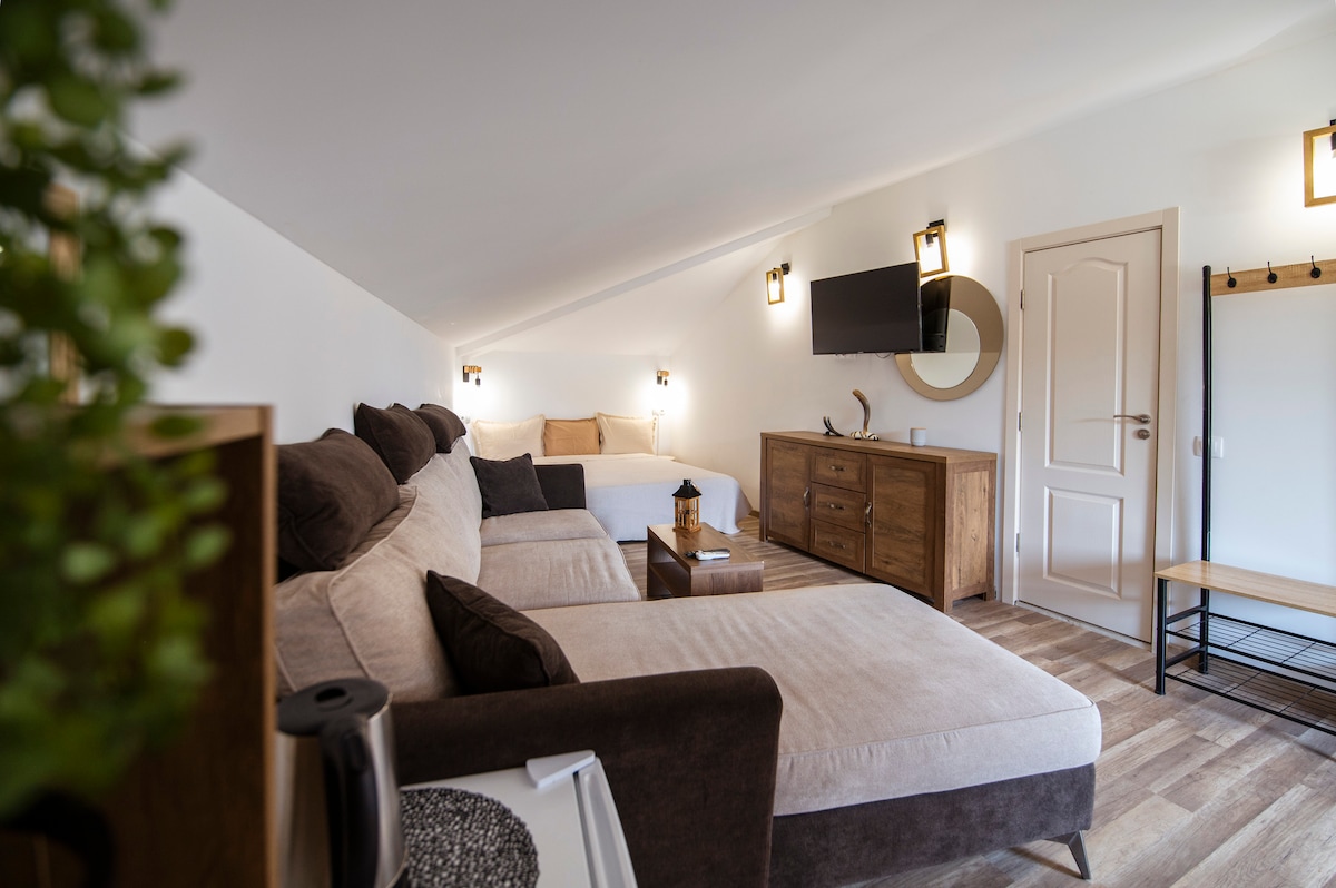 Студиото разполага с удобна спалня,мек комфортен диван,собствена тераса. На ваше разположение е сезонен басейн,обща кухня с всичко необходимо,обща механа с камина,общ двор с няколко къта за хранене на открито и закрито,детски кът,мини фитнес с йога постелка,тежести и ластици за тренировка,барбекю зона,открита тераса с шезлонги,чадъри и гледка към планината. Паркиране е възможно на обществен безплатен паркинг при наличие на свободни места.При запитване предлагаме и детски креватчета. Очакваме ви