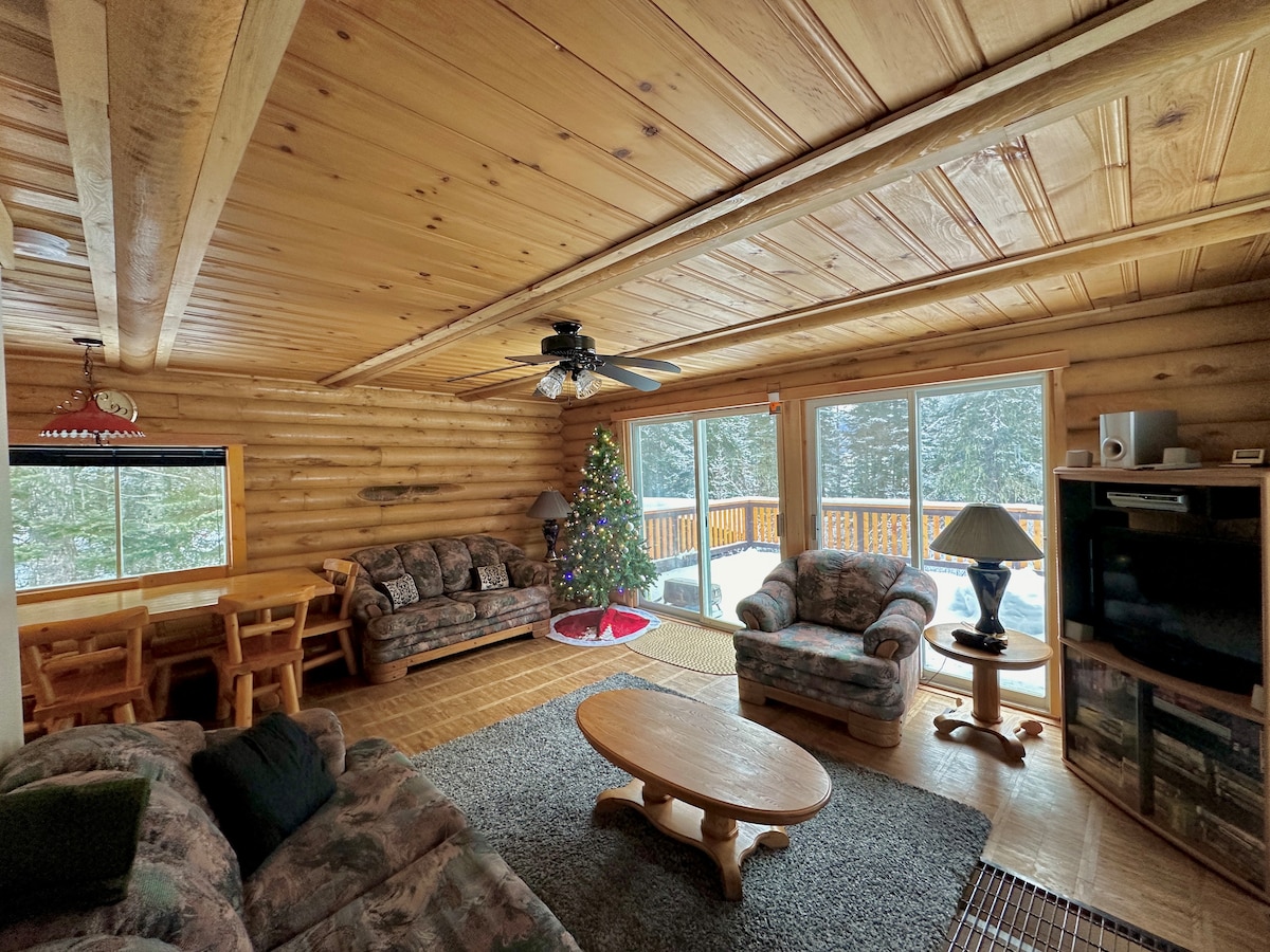 The cabin sleeps 6 (MAX) offering a Large kitchen with everything you would need to cook ! 3 bedrooms , 3 living rooms , dining room, 1 Bathroom with a soaker tub, many board games, foosball and arcade, 2 smart TVs, wifi and a wood burning sauna ! Located within minutes to popular destinations Powder King Resort(3 min drive) , Bijoux Falls, & Azouzetta Lake. 1/2 acre lot with a beautiful yard and fire pit to use in summer months . (Wood stove is not available for guests to use .)