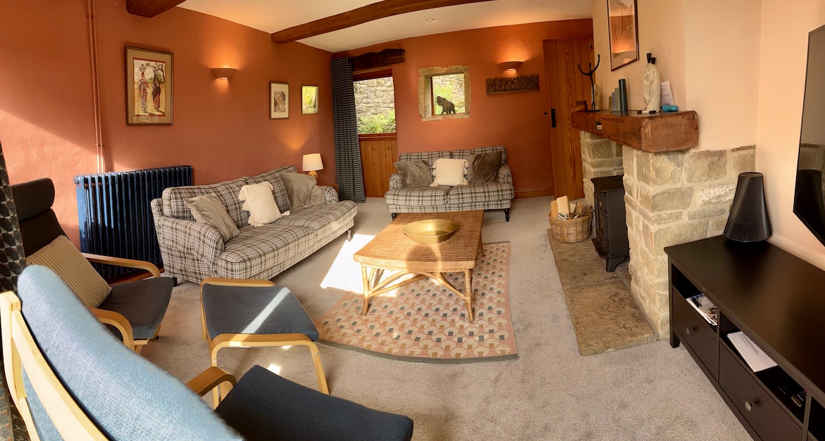 Perfect for two couples or a family an immaculate contemporary cottage in the Peak National Park, a stones throw from Chatsworth. A perfect spot to get away, relax and explore the stunning countryside right from the door. The cottage features beautiful outdoor spaces, a large stone fireplace with woodburning stove, wooden shutters, exposed beams, a fully fitted hand made kitchen, walk in rain showers and romantic roll top bath. BBQ on one of the two terraces or just relax and take in the view.